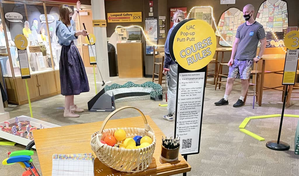 Pop-up putt-putt opened on the evening of February 2, 2022. Until March 2, 2022 it "pops up" in the LJAC gallery from noon, Wednesday, through noon, Thursday. Expect it to continue to pop up during winter months for years to come.
